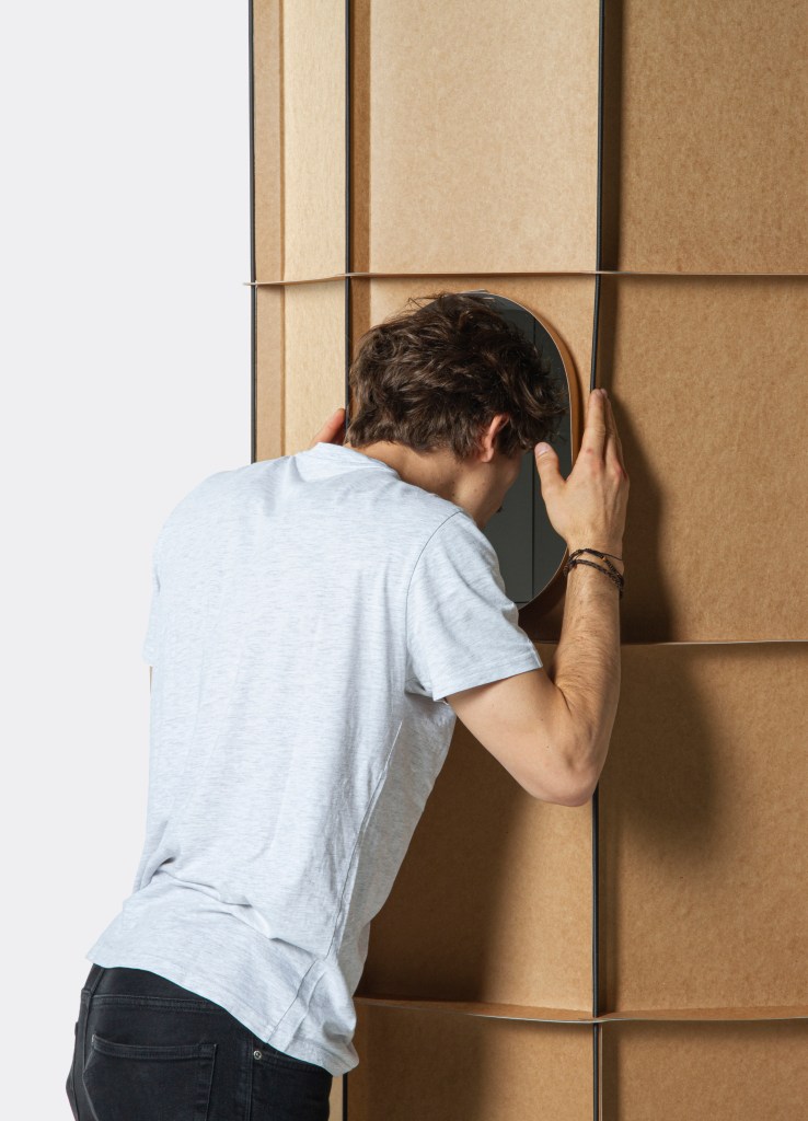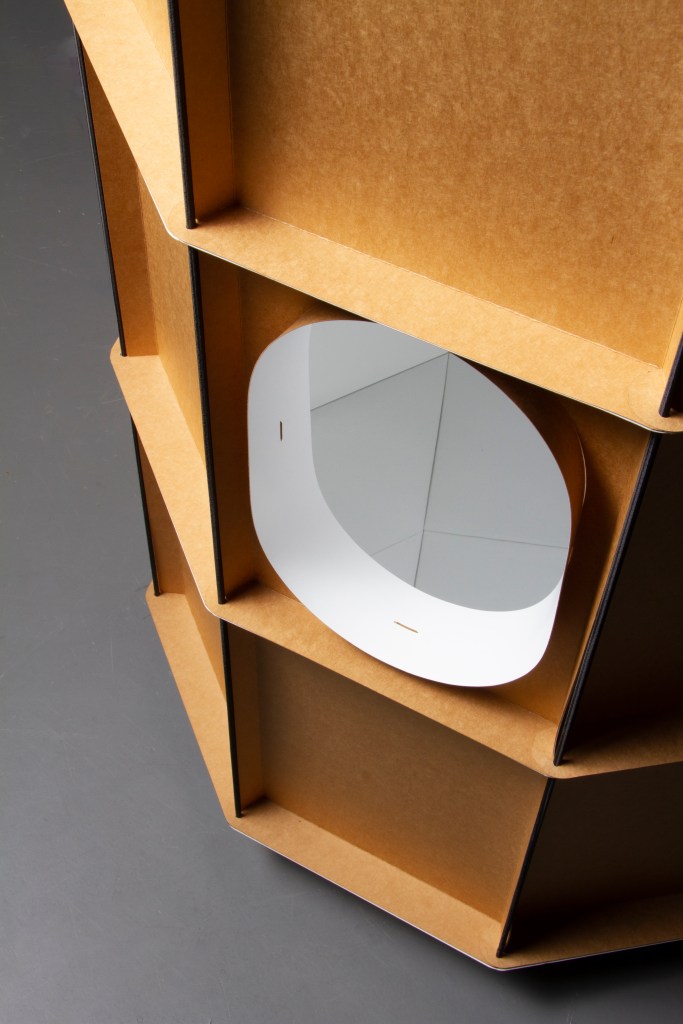 Infinity is a visual and sound installation which invites the user to enter into an infinite space. People can look through an opening and experience the echo of their own voice while seeing themselves in an infinite reflexion. The openings are positioned at different heights, allowing children and adults to interact freely inside the structure. Built out of duplicated cardboard modules linked by elastic ropes, the construction offers a maximum of effects with a minimum of means. It is efficient to produce, stackable in piles for transport, it can be quickly built in different kinds of shapes without the help of tools and is therefore inexpensive.