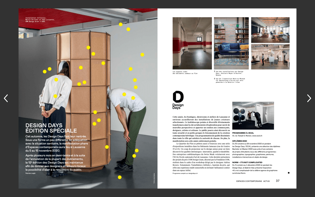 « INFINITY » is appearing in the catalogue Espaces Contemporain review n°4 octobre-september 2020. My project in collaboration with Theo Luvisotto will be exposed during the Design Days in Lausanne Flon from the 5th to 20th November 2020.