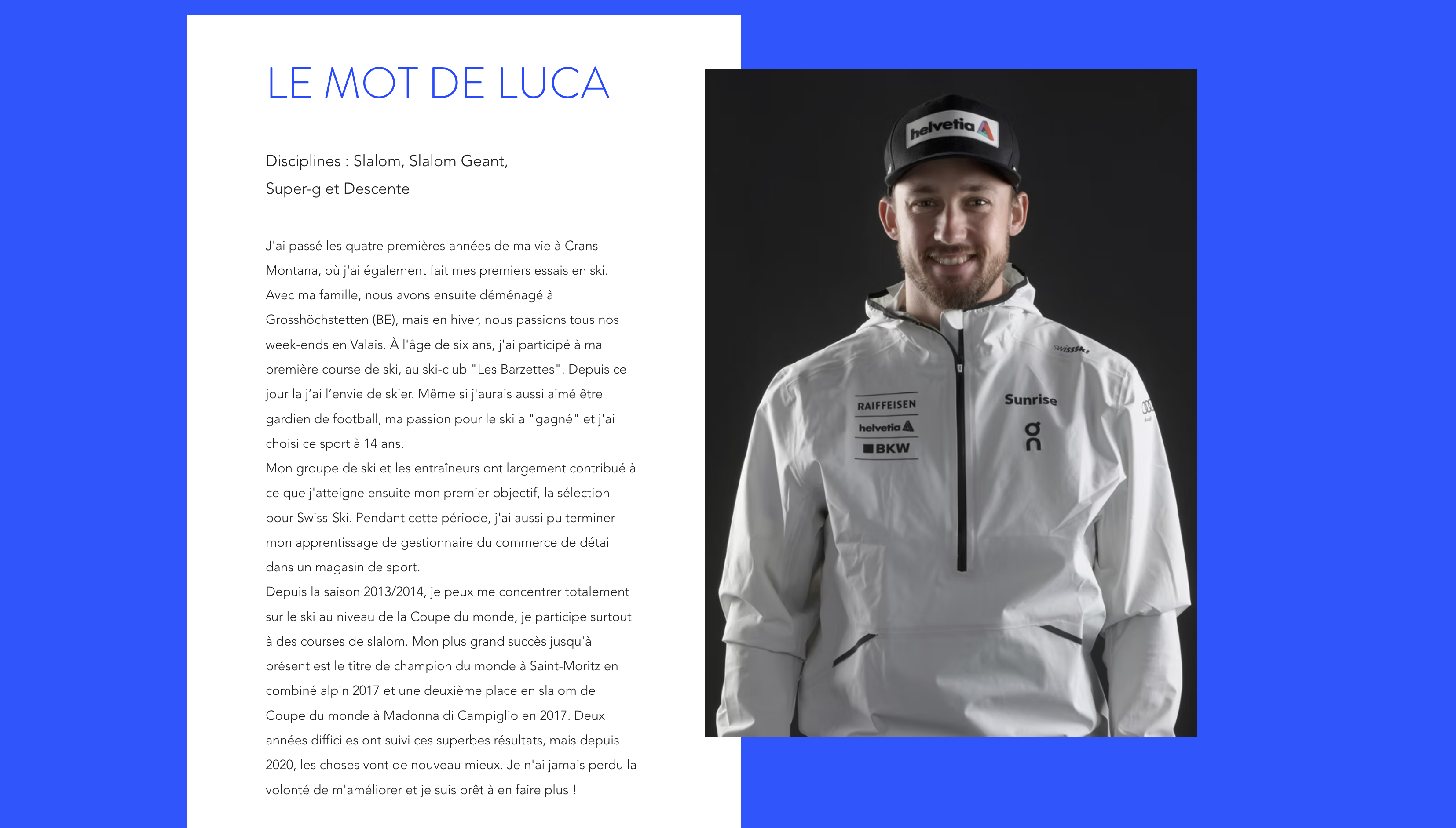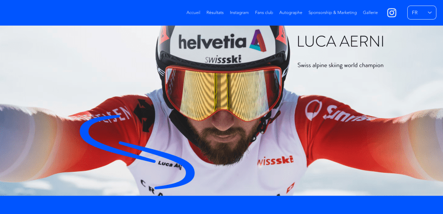 The Luca Aerni website is designed as a central hub to showcase his profile as a professional alpine skier.